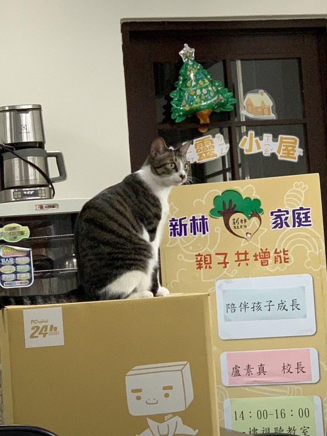 Oreo曾經在工廠附近流浪一陣子,後來被送到八里動物之家。老師第一次到動物之家認養校貓時,Oreo既主動又熱情地撲向老師,就好像在為自己慶祝找到了一個全新的歸宿。很順利地,Oreo踏進了新林國小的校園,成為了學校的校貓,陪伴孩子們一起學習與成長。