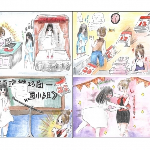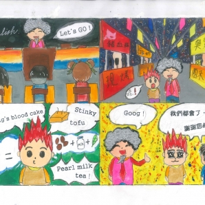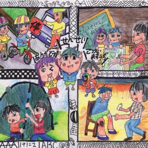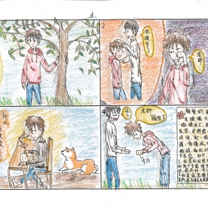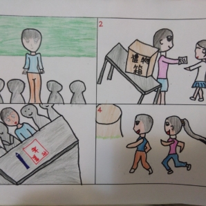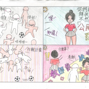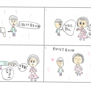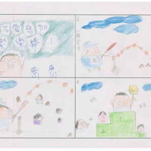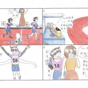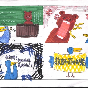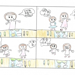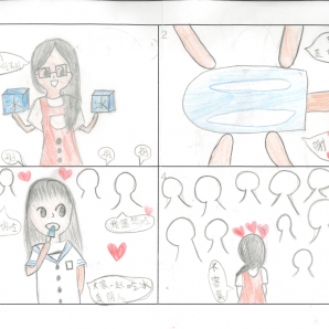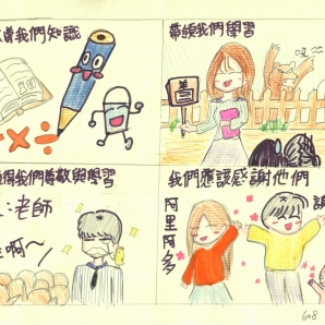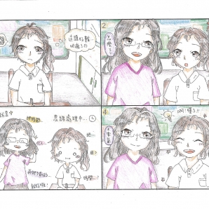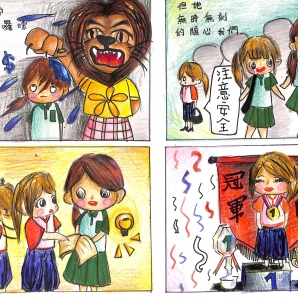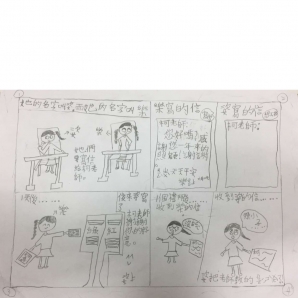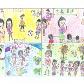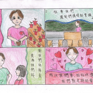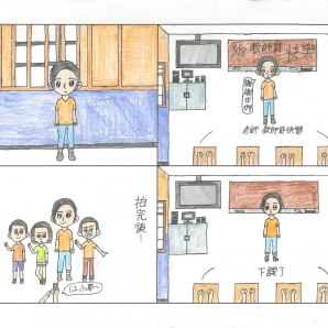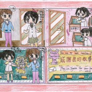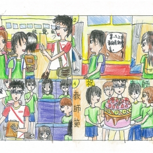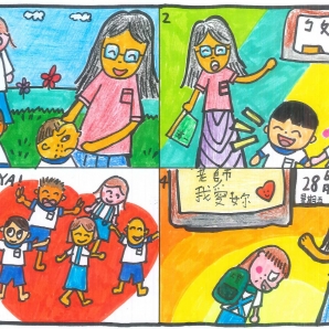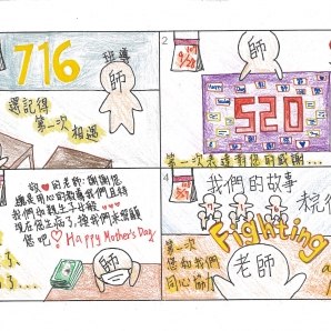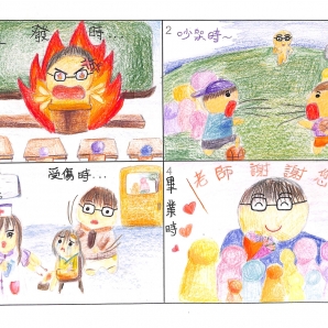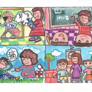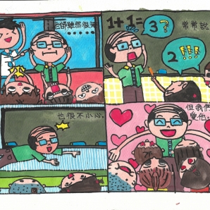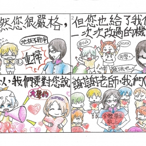 "圖中是我的班級日常遇到的小趣事,雖然老師像嚴格的媽媽,但也有溫柔的一面喔!! "