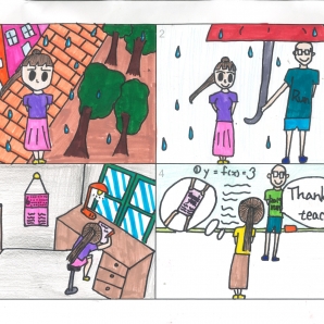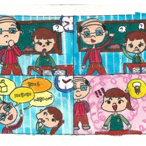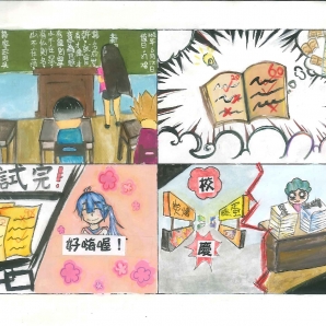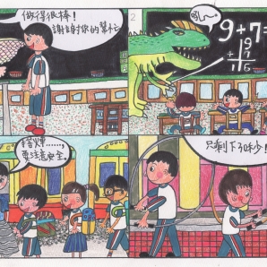 與老師之間逗趣的事。功課的恐懼,把事實誇大,加以繪畫。