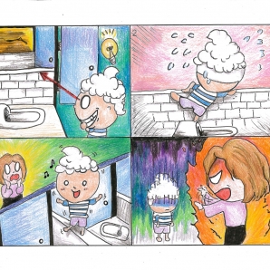 我想要透過這件作品來紀念在幼兒園裡,第一次被老師罵,因為我的頑皮,所以我爬上廁所裡矮矮的隔間並在上面...