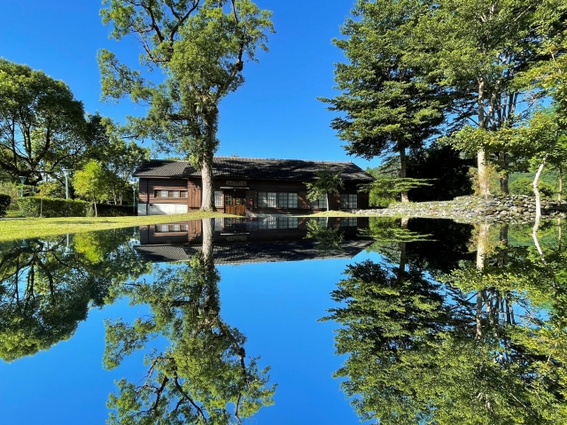 花糖百年,高高大樹與古味木屋相映成趣。雨後乍晴,忽見倒影更成絕美。珍愛之餘,尤期好者共享!