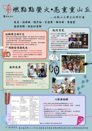 票選方式:由主辦單位將光點山丘各個學生社群之期末心得海報統整於「光點山丘成果分享 大會平台」,開放讓民眾自由投票 。