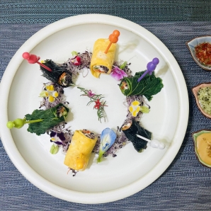 「睛彩春捲 七彩護眼」將羽衣甘藍、米線、胡蘿蔔、甜椒、紫高麗菜苗與鮮蝦包入透明春捲皮,搭配搭配酸甜醬...