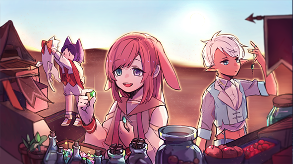 冒險的最後來到了一個奇幻的地方,弟弟妹妹將在異世界的〔懷錶〕〔沙漏〕放在檯子上,並向前前進