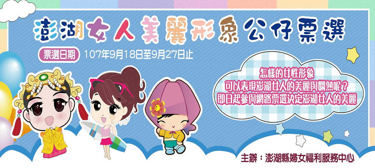 感謝網友參與澎湖女人形象公仔票選,經投票網站程式抽獎後產出15位超商禮券得獎者,名單公告如下,請得獎者私訊本粉絲團(澎湖縣天人菊婦女權益花園)聯繫對獎事宜,感謝大家參與: 粉絲團網址:https://www.facebook.com/chicarule/ 得獎名單:許慧婷、謝喬薇、黃彩錦、江秋玉、陳凱琳、陳麗英、Minna Ko、王雅惠、菊 の海、Jiun Huang、Tina Lu、Ying Ya Su、陳華田、黃淑芬、張美雯