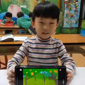 利用點擊積木來玩摘桃子的遊戲, 點到桃子還沒成熟的 只會搖一搖, 只有點擊到正確的桃子它才會掉下來...