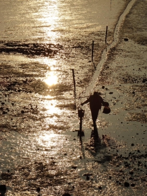 這幅作品拍攝於金門的潮間帶,夕陽餘暉灑落在廣闊的海面上,閃爍著金黃的光芒,如同鋪上一層溫暖的金紗。畫...