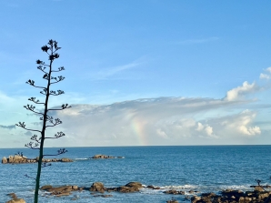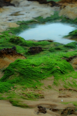 綠色的海藻依附在岩石與沙地之上,像是大海留下的綠色披風,柔軟卻又帶著野性。沙地與石塊交錯,構成了自然...