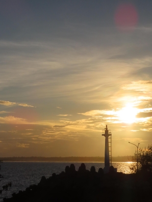 燈塔靜靜矗立在綿延無盡的消波塊上, 夕陽西沉,霞光灑落在波光粼粼的海面。 這裡,便是新湖漁港的海...