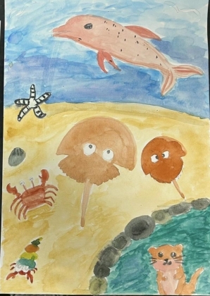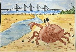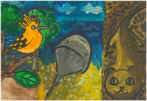我想用這幅畫來表現金門的特色動物:戴勝、鱟和水獺。這三種動物代表金門特別的生態,也是金門的特色。...