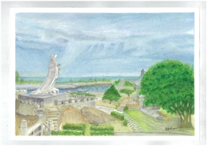 作品描繪的是夕陽下建功嶼的一角風景,使用用4開寶虹水彩紙,鉛筆構圖,水彩的形式呈現