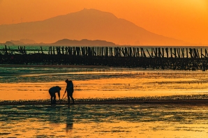 夕陽緩緩落下,金黃光芒灑在烈嶼的石蚵田上,海面閃爍著溫柔的光影。蚵架在潮水間靜靜矗立,彷彿守護著這片...