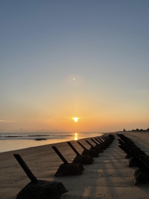 遠眺沙洲,海天一線,潮汐拍打岸邊,映照著天空的光影變化。沙洲在海面上靜靜延展,猶如連接陸地與海洋的橋...