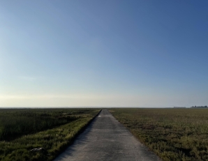 這條路宛如一條通往地平線的絲帶,筆直延伸至遠方。兩旁的草地輕柔相伴,遠處淡藍的天空與淺灰的海面相融,...