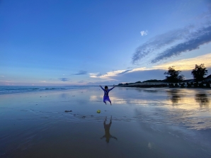 這張照片捕捉了孩子在海灘上跳躍的瞬間,整個姿態宛如要飛向無邊的藍天。天空的層層雲彩與海面倒影形成對稱...