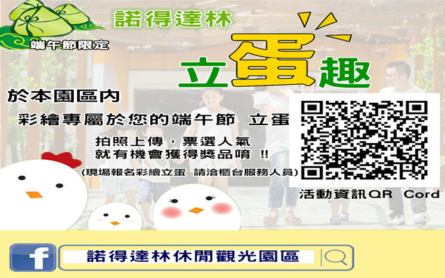 端午節為中國三大節慶之一,有許多的習俗文化與相關歷史,其中「午時立蛋」為端午眾多文化之一,為了讓現代的小孩除了知道端午節的由來歷史,希望透過「諾得達林休閒觀光園區的創意立蛋」活動,讓參與這項活動的遊客能感受濃烈的端午氣息,也能激發自己的想像力,創造不同的端午立蛋。