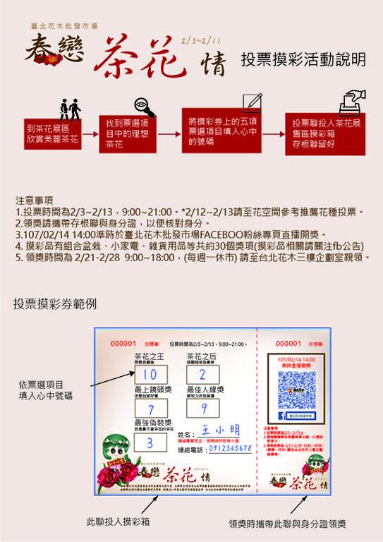 2.2/3開幕式當天現場會發放限量盆栽唷~~~ 3. 2/3~2/14現場還有茶花票選活動 投票抽好禮唷~~~~(2/14直播開獎)